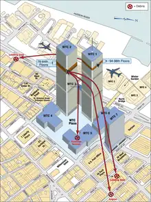 Hundreds were killed instantly, including everyone on the plane and numerous others in its path.[57] Many who had been outside of the path of the crashing airliner were incinerated as its fuel exploded.[58] Studies suggest that as many as 1,426 people may have been present on the top 18 floors of the North Tower when it was struck almost midway into its central core.[lower-alpha 2] The core housed three stairwells (A, B and C) extending from the roof to the ground floor, with a distance of just 70 feet (21 metres) between each one in the impact region.[59] The size of the hijacked 767 easily severed all three, trapping close to a thousand crash survivors.[60] All stairwells from floors 93 up to 99 were destroyed or blocked and elevator service was disrupted from the 50th floor upward.[61] The airplane descended downward at an angle of about 10 degrees at impact, pushing rubble into stairwells as many as six stories below where it hit; consequently, the 92nd floor was also sealed off from the rest of the tower when falling debris from Flight 11's impact zone walled off each of its stairwells.[62] The highest survivors in the North Tower came from the 91st floor, while anyone above was left to burn alive, asphyxiate, succumb to toxic exposure from ignited chemicals or be killed in the tower's eventual collapse. Some 100–200 people plummeted from the upper floors, most of whom died by jumping to escape the torturous heat, smoke and flames.[63][64] Light-to-moderate damage was reported on every floor from ground level to the 92nd, including collapsed walls, missing ceiling tiles, severed wires and smashed windows. The sprinkler system was severed by the impact, causing flooding on various floors throughout the tower. Moreover, burning jet fuel was channeled through the building via elevator shafts and ductwork,[65] igniting small-scale fires on many floors between the 77th and 91st. Three major flash fires occurred in the 78th and 44th floor skylobbies as well as the main lobby at the base, causing fatal burns nearly a hundred floors below the impact.[66] The shockwave was felt in both towers.[67] The northern and western façades of the South Tower were battered by debris[68] and a limited number of windows were broken by the explosion. Prevailing winds from the northwest caused the top of the South Tower to become engulfed by the thick smoke pouring southeast, and a number of employees at that altitude reported that the fumes began filtering into their floors alongside the intense heat.[69][70]