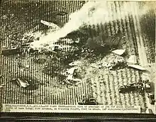The 707 departed Idlewild at 1:40pm, accomplished high altitude air work after takeoff to permit sufficient fuel burn-off for airport transition training which was planned at Calverton, and arrived there around 3:11pm. Flight 514 accomplished several maneuvers, including full-stop landings, crosswind landings and takeoffs, a high off-set approach, simulated engine out landings, and a no-flap aborted approach to landing. The aircraft did not retract its landing gear following the last aborted approach to landing on Runway 23, but continued in the traffic pattern at an estimated altitude between 1,000 and 1,100 feet (300 and 340 m). The crew reported on left base leg for Runway 23, was given clearance to land, and was informed that the wind was from 230 degrees at 10 to 15 knots (12 to 17 mph; 19 to 28 km/h). As it approached the extended centerline of the runway, around 4:42pm, it made a left bank that reached approximately 45 degrees. The aircraft was then observed to recover immediately to level flight and to begin a bank to the right which became progressively steeper. The right bank continued until the aircraft was inverted, at which time the nose dropped and a yaw to the left was observed. The 707 then continued to roll to the right in a nose down configuration. Shortly before impact, the wings leveled one final time. Investigation revealed the aircraft struck the ground in a wings-level attitude, in a nearly stalled condition, yawed to the left approximately 12 degrees, with considerable and nearly symmetrical power. The aircraft crashed in a potato field, a fire erupted on impact, and all five aboard were killed.[1] The crash occurred only a few miles from the Brookhaven National Laboratories, a site of key secret nuclear work.[2]