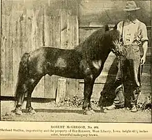 The American Shetland Pony is an American breed of pony. It derives from the traditional Shetland Pony from the Shetland Isles of Scotland, but as a result of cross-breeding with other horse and pony breeds, is taller and more elegant.[1]: 435 It does not have the thick coat of the traditional Shetland, and in conformation is more similar to the Hackney Pony, with some Arab influence.[2]: 243 It is the most numerous pony breed in the United States; numbers in 1994 were estimated at over 50,000. It is one of two American pony breeds derived from the traditional Shetland, the other being the Pony of the Americas.[2]: 243