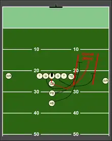Also called a Halfback Lead, this is one of the most basic power runs in football. It is designed to isolate the fullback on a block with a linebacker, giving the halfback an easy 5 yard gain. Meanwhile, the other linebackers are blocked on combo blocks from the offensive line. Because it requires a fullback, it is usually run out of I-formations, however there are several variants of the play that can be run in other formations.