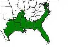 The American green tree frog is found in the central and southeastern United States with a geographic range from the Eastern Shore of Maryland to southeast Florida with populations as far west as central Texas and as far north as Delaware and southern New Jersey. The American green tree frog is considered monotypic, but clinal variation has beven observed from Florida north along the Atlantic coastal plain. This may be attributed to the result of strong selection and/or drift.[4]