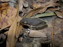 Females are larger than males. Pairs breed through amplexus.[4] Males emit low frequency advertisement calls to attract females.[7] During mating competition, males will eavesdrop on neighboring rivals and either adjust their signal timing or remain silent to intercept call signals and mate with approaching females.[7][8] Androgens energize males to vocalize.[5]