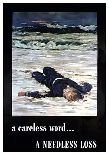 The Office of War Information (OWI) Bureau of Graphics was the government agency in charge of producing and distributing propaganda posters.[16] The main distinction between United States poster propaganda and that of British and other allied propaganda was that the U.S. posters stayed mostly positive in their messages.[16] The United States posters focused on duty, patriotism and tradition, whereas those of other countries focused on fueling the people's hatred for the enemy.[16] The positive messages on U.S. posters were used to increase production on the home front instead of insuring that the "money raised was not lost."[16] American posters rarely used images of war casualties, and even battlefield scenes became less popular, and were replaced by commercial images to satisfy the "consumer" need for the war.[17]