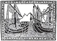 Woodcut depicting Vespucci's first voyage to the New World, from the first known published edition of his 1504 letter to Piero Soderini