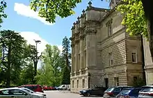 The mansion stands in pleasure grounds and parkland, in all about 140 acres (56 ha), which in 1987 were listed Grade II* on the Register of Historic Parks and Gardens of special historic interest.[7] Three features are themselves Grade II* listed: the ornamental bridge (1775)[12] and Chinese temple (1772),[13] both by Sir William Chambers; and Guy's Cave, a late-18th-century grotto set under the east side of the hill known as Vespasian's Camp.[14]