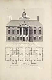 This house was rebuilt in 1660–1661 to designs of John Webb, for William Seymour (1588–1660) and his successor, a grandson, also William.[1][2] In 1720 it was bought by Lord Carleton,[3] and was included in Colen Campbell's 1725 Vitruvius Britannicus, a collection of engravings of the great houses of the time.[4] Harrison's 1786 Picturesque Views of the Principal Seats of the Nobility and Gentry[5] shows single-bay wings added by the Duke of Queensberry, perhaps designed by Henry Flitcroft.[2] It has been described as "the perfect example of the 'temple front' house, formed by adding a pedimented temple portico to a domestic block".[6] From the mid-18th century the house became known as Amesbury Abbey.[7]