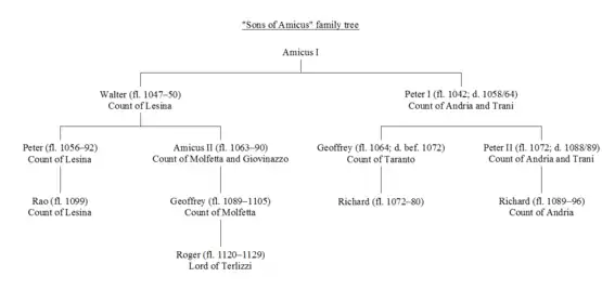 Amicus II belonged to a family known to modern scholars as the "sons of Amicus". His grandfather and namesake, Amicus I, lived in Normandy before 1030. Two of the latter's sons, Walter and Peter I, arrived in Italy before 1038. Walter was the father of Amicus II and Peter of Lesina. Amicus was thus the first cousin of Peter I's sons, Geoffrey of Taranto and Peter II of Trani.[1] The family was related—how is not known—to the Hauteville family.[2]