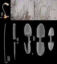 | Amphilectus strepsichelifer sp. nov., Holotype ZMA Por. 07564. A. Habit. B-C. Cross section of skeleton in light microscopy. B. Peripheral skeleton. C. Detail of peripheral tracts and clustered microscleres. D-E. SEM images of spicules. D. Style. D1. Details of apices. E. Palmate isochelae, in various stages of torsion. | |