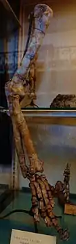 This specimen was from a large male A. giganteus with the skull measuring 14 in (36 cm) from the Late Miocene in China, comparable to a male lion or tiger.[19] Deformation of the skull through natural fossilization processes has changed the shape slightly, making it asymmetrical, but overall it remains an excellent specimen for studying the cranial morphology of this particular genus and species.