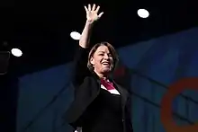 Klobuchar's popularity and polling numbers surged in the week between the Iowa caucuses and the 2020 New Hampshire Democratic primary, rising dramatically after the February 7, 2020, Democratic Party presidential debate.[44][45][46] In the 48 hours following the debate, her campaign received $3 million in donations and she began polling in third place, ahead of Elizabeth Warren and Joe Biden.[47][48][49]