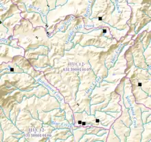 The creek watershed is designated by the United States Geological Survey as sub-watershed HUC 031300010105, is named Amys Creek-Chattahoochee River sub-watershed, and drains an area of approximately 20 square miles northwest of Clarkesville, and east of the Chattahoochee River. In addition to Amys Creek, which is joined by Amos Creek from the north, the area is drained by Car Creek and Mauldin Mill Creek to the west of Amys Creek, both of which flow into the Chattahoochee north of where Amys Creek joins the river.[3]