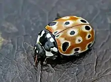 Anatis ocellata, commonly known as the eyed ladybug, is a species of ladybug in the family Coccinellidae. It has black spots on a red background, with each spot surrounded by a yellowish halo. In one color variation, a specimen found in Scotland was reported having the spots fused to form longitudinal lines.[1] Sometimes can also be found variation where black spots are absent.[2]