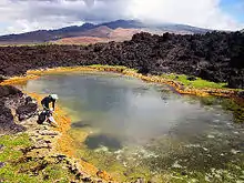 Anchialine systems are also commonly found in coastal mafic volcanic environments such as the Canary Islands, Galapagos Islands, Samoa, and Hawaii. Lava tubes are the primary mechanism that creates anchialine systems in these volcanic environments.[4] Lava tubes occur during eruptions of fluid-flowing basaltic pahoehoe lava. As lava flows downhill, the atmosphere and cooler surfaces come in contact with the exterior of the flow, causing it to solidify and create a conduit through which the interior liquid lava continues flowing. If the solid conduit empties of liquid lava, the result is a lava tube.[6] Lava tubes flow towards lower elevations and typically stop upon reaching the ocean; however, lava tubes can extend along the seafloor or form from submarine eruptions creating anchialine habitats.[4] Saltwater intruded into many coastal lava tubes during the marine transgression after the last glacial maximum creating many volcanic anchialine pools observed today. Volcanic anchialine systems typically can develop more rapidly than karst systems; on the order of thousands to tens of thousands of years due to their rapid formation at or near the Earth's surface, making them vulnerable to erosional processes.[6]