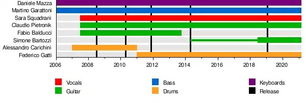 In September 2010, Alessandro left the band, to be replaced by a new drummer Federico Gatti. The latest line-up change occurred in the end of 2013 after recording the third album A New Dawn Ending, when Balducci left the band for personal reasons.[2] For live shows in 2014 Simone Bertozzi filled in as a guest second guitarist.[3]