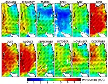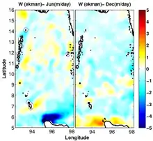 The effect of wind stress on the ocean surface can be explained by wind stress curl. The net divergence of water in the ocean mixed layer results in Ekman pumping.[3] The contrast between the two seasons elicits a very strong negative pumping velocity of more than 5 m (16 ft) per day along the north coast of Indonesia from May to September (shown here, June). This may signify coastal downwelling in the summer. It is also observed that the region develops a weak but positive pumping velocity of less than 3 m (9.8 ft) per day at the mouth of GC in winter (here, December).