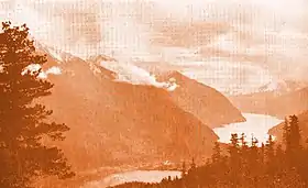 The region comprises a mix of volcanic and sedimentary rocks.[2] At the end of the Last Glacial Period (LGP), Seton and Anderson were a single continuous lake, with a level about 100 metres (330 ft) higher than present. At the Seton Portage area, erosion and landslides of weak rocks susceptible to rapid weathering tumbled into the lake, and tributaries deposited sediment. Over tens of thousands of years, the accumulation created separate lakes, and a river formed from Anderson to Seton,[5] which by 1910 was about 18 metres (60 ft) lower[6] (currently 15 metres (50 ft)).[7] Minimal agricultural land exists along the mountainous shores of the lake beyond a limited area at the portage.[8] Here, a noticeable gap in the mountains indicates a large landslide on the east side.[3]