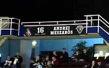 The following season, he went overseas to North America to play junior ice hockey in the Western Hockey League (WHL) with the Vancouver Giants. Meszároš recorded 41 points in 59 games with Vancouver — fifth in WHL rookie scoring — and was named to the Western Conference's Second All-Star Team. He was also named the Giants' Rookie of the Year and Top Defenceman.[2] Nearly six years later, he was inducted into the Giants' Ring of Honour, a series of banners inside the Pacific Coliseum commemorating the team's best alumni.