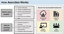 Anecdata.org (often shortened to Anecdata) is a citizen science web portal developed by the Community Environmental Health Lab at the MDI Biological Laboratory in Bar Harbor, Maine.[1] Anecdata.org supports projects in the collection of observational data, primarily in environmental science, biology, and public health.[2] Anecdata was founded in 2014 to provide a data management system for the citizen science projects run by the Community Environmental Health Lab and has since expanded to include more than 200 projects, where more than 8,000 registered users have contributed over 30,000 images and more than 50,000 observations.[3] In addition to the desktop site, there is a corresponding mobile app that can be used to submit observations to existing projects.[3] Anecdata.org also acts as a data repository where data can be stored, discovered, and shared to other users.[4]