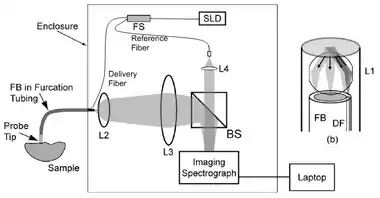 At the distal end of the fiber bundle, light from each fiber is imaged onto the spectrometer. Light from the sample and reference arms are mixed by a beamsplitting cube (BS), and are incident on the entrance slit of an imaging spectrometer. Data from the imaging spectrometer are transferred to a computer via universal serial bus interface for signal processing and display of results. The computer also provides control of the imaging spectrometer.