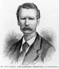 Mackay was made the Queensland trade commissioner to the 1876 Centennial International Exhibition in Philadelphia, Pennsylvania.[15][2][16] Leaving in January 1876, he was tasked with promoting Queensland mining and industry, and authorised to purchase labour-saving and other devices at the Exhibition.[2] Exhibits included 200 specimens, 3 feet (0.91 m) long and 6 inches (150 mm) square, of Queensland timber, and ores such as tin and copper.[17]