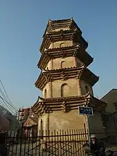 ![]() Surviving White Pagoda (center) of Shuixin Chan Temple (right), with the adjacent old residential neighborhood (left) demolished, to make way for new development (such as seen in the background) | |