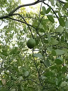 The fruit of Anisocapparis speciosa are green spherical berries with a shiny exterior. They are 3–5 centimetres (1.2–2.0 in) in diameter and hang from long peduncles. They contain a yellow-orange pulp and four to eight dark, subglobose seeds[6][4] which are strongly anisocotylary. They have a compact major cotyledon and a reduced or suppressed minor cotyledon.[5]