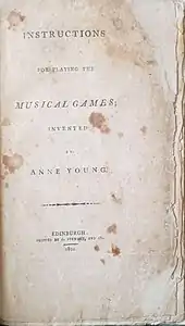 After her death, An Introduction to Music was reissued in 1820, which included six more "Elementary Games".[11] These games taught the basic fundamentals of musical theory and were likely designed to be played before progressing onto the original 1801/03 games. It is unclear if Anne intended to publish these Elementary Games before her death.