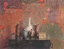 Her later work has been almost entirely still-life. She enjoys playing with shapes, pattern and colour, mixing the familiar with some abstraction, and precision with suggestion. Her foregrounds are a few simple objects, usually pots, and backgrounds are created from textiles or old newspaper cuttings, and even some unfinished paintings as a starting point.