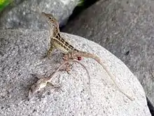 Anoles have repeatedly evolved into similar forms on different islands, dubbed 'ecomorphs'. Convergence is in microhabitat specialty, behavior, and morphology.[3] Langerhans, Knouft & Losos call the set of Anolis lizard ecomorphs of the Greater Antilles "a classic example of convergent evolution."[4][5] Jonathan Losos defined six Anolis ecomorphs according to the predominant microhabitat (e.g. grasses, open ground, different parts of trees) of the respective Anolis: crown giant, trunk-crown, trunk, trunk-ground, twig, and grass-bush.[5][6]