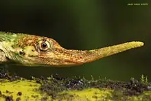 Anolis proboscis, commonly known as the horned anole, Ecuadorian horned anole[2] or Pinocchio lizard,[3] is a small anole lizard in the family Dactyloidae. A single male specimen was discovered in 1953 in Ecuador and formally described by Peters and Orces in 1956, but the species then went unreported until its rediscovery in 2004. Its currently known habitat is a small stretch of vegetation along an Ecuadorian highway. It has been classified as Endangered by the IUCN due to its restricted distribution and ongoing habitat loss.