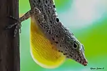 It is locally known as the lagartijo manchando in Puerto Rico.[2][5][6][7] Names which have been coined for it in English are spotted anole,[2] Puerto Rican spotted anole (in Puerto Rico),[8] banded anole (in Puerto Rico),[2][5] saddled anole,[9] salmon lizard,[6] barred anole,[6] St. Thomas anole[2] or the somewhat of a misnomer chameleon, because it can change color. It is known as the "spotted anole" because of the black markings on its back;[8] the Spanish word manchado means as much. There are no salmon in Puerto Rico; the name "salmon lizard" may have been invented for tourists in 2007 by Alan Mowbray, 'interpretive media writer' for the website of El Yunque National Forest,[6] referring to the trout-like colour pattern of its flanks or the perhaps his interpretation of the color of the skin. The names "saddled anole" and "barred anole" are likely taken from the 1862 description by Edward Drinker Cope, although it is not really true, Cope believed that the lizards were characteristically saddled with brown transverse bars on their back. The name "banded anole" may also refer to that.[3] "St. Thomas anole" is also from Cope; although he was immediately corrected in a 1862 Danish publication, in his original English-language publication he stated the anole was only found on the island of St. Thomas.[3][4]