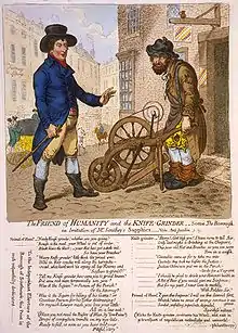 According to David A. Kent and D. R. Ewin's book, Romantic Parodies' 1797-1831, “The Anti-Jacobin is now remembered for its parodies of Robert Southey more than for its journalism, patriotic verse, or Latin imitations”.[19] Southey was the victim to four parodies written in the Anti-Jacobin because of his usage of experimental meters in poetry and sympathies in politics towards the republicans.[19] Three poems that were made into parodies by the Anti-Jacobin were, Southey's “Inscription”, “The Widow”, and “The Soldier’s Wife”. Canning wrote “For the Door of the Cell in Newgate, where Mrs. Brownrigg, the Prentice-cide, was confined previous to her Execution”—a response to Southey's lines from “For the Apartment in Chepstow Castle where Henry Marten the Regicide was imprisoned for thirty years”.[20] This piece had been considered an idealistic, republican, and well-written Jacobin piece. Canning replaces the main character, Marten, with the character Elizabeth Brownrigg, who was popularized by the work the Newgate Calendar. In this piece of literature, Brownrigg is depicted as a villain who awaits screams, curses, and demands for a strong drink before her execution.