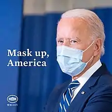 President Donald Trump largely resisted wearing masks in public media appearances,[4][5][6] and did not mandate their use at his campaign events during the 2020 presidential election.[7][8] After briefly encouraging their use in mid-July,[9][10] Trump continued to hold campaign events (such as the 2020 Republican National Convention) where masks were not widely used,[11][12][13] and publicly mocked Joe Biden for wearing face masks in public appearances.[14][15][11] After Biden was sworn in as president in January 2021, his first executive orders included mandating the wearing of masks on public transport systems and more vigorous enforcement of COVID-19-related health and safety protocols, including masks on federal properties.