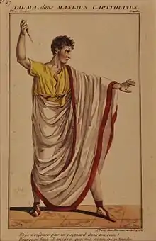 La Fosse's chef d'œuvre Manlius Capitolinus (1698) about Marcus Manlius Capitolinus (died 384 BCE), was imitated from the English dramatist Thomas Otway's play Venice Preserv'd, who in turn had taken his plot from César Vichard de Saint-Réal's Conjuration des Espagnols contre la République de Venise en l'Année M. DC. XVIII (1674).[13][14][15] La Fosse's later plays were not as successful, but according to theater historian Phyllis Hartnoll in The Oxford Companion to the Theatre, many of his contemporaries thought he might have rivalled Jean Racine had he began his dramatic career earlier.[16]