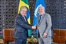 Guterres praised the Israel–United Arab Emirates peace agreement, stating that he welcomes "any initiative that can promote peace and security in the Middle East region."[78] Guterres expressed the hope that the agreement between Israel and Sudan to normalize relations would create opportunities for peace and prosperity.[79] On 10 August 2020, responding to an explosion in Beirut, Guterres expressed his support for all people in need in Lebanon, especially women and girls who are most vulnerable in times of crisis.[80] On 22 September, he appealed for global solidarity to overcome COVID-19, and again called for a global ceasefire by the end of 2020.[81] In September 2020, Guterres stated that he would continue with "a serious dialogue" with UN member states, for a comprehensive Reform of the UN Security Council.[82]