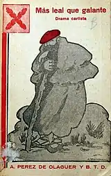 In terms of drama Pérez de Olaguer underwent internship period in the early 1930s; working for Enrique Rambal he co-adapted novels for stage performance, tasked with providing intriguing episodic dramas which merged high action with musical interludes.[46] Likewise he adapted his own novel into a 3-act play (1933),[47] which was actually staged.[48] His greatest success as a playwright came with Más leal que galante (1935), written together with Benedicto Torralba de Damas. Set in the Third Carlist War and written in a light verse, the comedy featured a complex romance intrigue with clear Carlist message in the background;[49] its popularity stemmed from smart and pacy intrigue, well-written rhymed dialogues and a blend of romantic and patriotic features. The play was performed countlessly especially in the Nationalist zone[50] and later in the Francoist Spain;[51] there were great Spanish actors like Carmen Díaz starring[52] and great political personalities like Queipo de Llano attending.[53] Another comedy followed in 1935;[54] it failed to repeat the success, though it was later performed in the Philippines and attended by president Quirino.[55] In the 1950s Pérez de Olaguer kept adapting novels for Rambal[56] and wrote libretto for a zarzuela.[57] Only one of his own late plays was performed commercially;[58] others were one-act dramas performed at amateur or religious stages.[59]