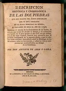 Antonio de León y Gama (1735–1802) was a Mexican astronomer, anthropologist and writer. When in 1790 the Aztec calendar stone (also called sun stone) was discovered buried under the main square of Mexico City, he published an essay about it, Descripción histórica y cronológica de las dos piedras que con ocasión del nuevo empedrado que se está formando en la plaza principal de México, se hallaron en ella el año de 1790 (Historical and chronological description of two Stones that were found in the plaza of Mexico in 1790 upon the occasion of laying the new pavement) explaining the functioning of aztec calendars.[1][2]