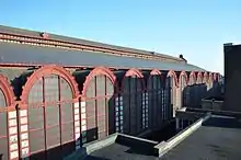 During World War II, severe damage was inflicted to the train hall by the impact of V-2 rockets, though the structural stability of the building remained intact, according to the National Railway Company of Belgium.[1] Nevertheless, it has been claimed that the warping of the substructure due to a V-2 impact had caused constructional stresses.[2] The impact remains visible due to a lasting wave-distortion in the roofing of the hall.[1]