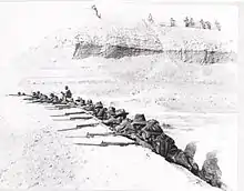 Preliminary manoeuvring began on 16 April and the main attack would start the next day. At 02:00, the division was in position at Shellal.[56] Reconnaissance patrols convinced Chauvel they would be unable to break through the Ottoman line without infantry support. The main infantry battle began at 07:15 on 19 April following a two-hour bombardment, with the division deployed to attack Sausage Ridge on the extreme right of the three British infantry division's assault at Gaza.[57] The division suffered severe casualties while it was comparatively inactive during the infantry attacks. However, during the previous night of 18/19 April, Chauvel – under orders not to make a dismounted attack – moved towards the Hareira Redoubt to protect the army's right.[58] In the morning of 19 April, the 1st and 3rd Light Horse Brigades advanced without opposition. However, by mid-afternoon they were confronted by around one thousand Turkish cavalrymen, whom they fought off with rifle, machine-gun and artillery fire. By 20 April, the attack had halted in a decisive victory for the Turkish forces. The attack cost the British 5,900 casualties, but only 105 of those were from the division – [59] the fewest of any involved.[60][nb 8]