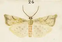 The wingspan is 21–24 mm. The forewings are pale yellow, irrorated (speckled) with purplish-brown. The markings in the males very obscure. The hindwings are pale whitish yellow sprinkled with purplish-brown.[3]