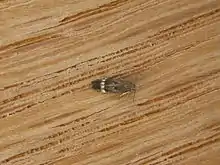 The wingspan is 9–12 mm. The forewings are rather dark bronzy fuscous with an elongate dark fuscous mark on the fold before the middle, sometimes interrupted by a ferruginous-ochreous dot, sometimes followed by some whitish scales. There is sometimes an indistinct dark fuscous discal dot in the middle and a small whitish spot on the tornus, and a larger clear white subtriangular spot on the costa opposite, almost meeting. The hindwings are grey, darker posteriorly.[3]