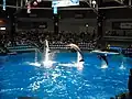 Since partnering with Epson and Maxell, aquariums have incorporated projection mapping into entrance hall and dolphin shows.[17] The Stadium has 1,350 seats, and there are shows by Pacific white-sided dolphins, bottlenose dolphins, and false killer whales that make full use of technology such as water curtains. [18][19] Also, the dolphin show at The Stadium is different day and night.[20]