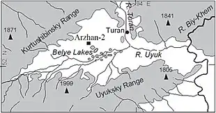 Arzhan[lower-alpha 1] is a site of early Saka kurgan burials in the Tuva Republic, Russia, some 60 kilometers (40 mi) northwest of Kyzyl.[1] It is on a high plateau traversed by the Uyuk River, a minor tributary of the Yenisei River, in the region of Tuva, 20 km to the southwest of the city of Turan.[2]