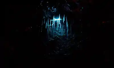 Arachnocampa luminosa (Skuse, 1891), commonly known as New Zealand glowworm or simply glowworm, is a species of fungus gnat endemic to New Zealand. The larval stage and the imago produce a blue-green bioluminescence.[2] The species is known to dwell in caves and on sheltered banks in native bush where humidity is high.[3] Its Māori name is titiwai, meaning "projected over water".