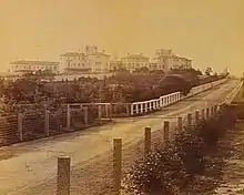 Another distinctive feature of Ararat and other early Victorian asylums is the use of a variation on ha-ha walls around the patients' courtyards.[4] They consisted of a trench, one side of which was vertical and faced with stone or bricks, the other side sloped and turfed. From the inside, the walls presented a tall face to patients, preventing them from escaping, while from outside the walls looked low so as not to suggest imprisonment.[5]