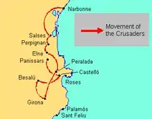 The crusade, a part of the larger War of the Sicilian Vespers, was declared by Pope Martin IV against King Peter III of Aragon in 1284 and 1285.[1] Because of the recent conquest of Sicily by Peter, Martin declared a crusade against him and officially deposed him as king, on the grounds that Aragon was a papal fief:[1] Peter's grandfather and namesake, Peter II, had surrendered the kingdom as a fief to the Holy See. Martin bestowed Aragon on Peter's nephew Count Charles of Valois, son of King Philip III of France.[1]