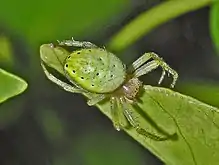 Adults can be found mainly from May to July, but females last as late as September.[3] These spiders do not use a hideout, because they are camouflaged by their green colour. They weave their orb-web between leaves and flowers. These webs are irregularly shaped and only about 100 mm (3.9 in) in diameter. They have between 15 and 30 rays. The spider usually stands in the middle of the web while waiting for prey. Egg sacs are commonly attached to the underside of leaves.[9]