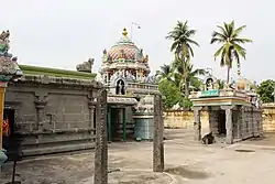 The temple has a three-tiered gateway tower and all the shrines of the temple are enclosed in concentric rectangular granite walls. The temple occupies an area of around 1 acre (0.40 ha). The central shrine houses the image of Arasaleeswarar in the form of Lingam. The image of Lingam is made of sand and sacred ablution is performed only on the Aavudayar. The shrine of Kiriraca Kannikar, the consort of Shiva facing West is located in the Mahamandapam leading to the sanctum. The central shrine is approached through the flagstaff and Mahamandapam, both which are located axial to the gateway. The central shrine has entrance towards South and can be approached circumbulating the shrine. The temple tank is located outside the main entrance tower. As in other Shiva temples in Tamil Nadu, the shrines of Vinayaka, Murugan, Navagraha, Chandikesa and Durga are located around the precinct of the main shrine.[5]