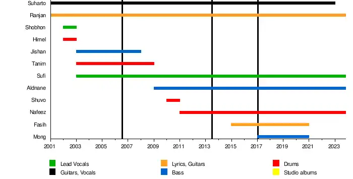 Around mid-2002, Ishtiaq Jishan and Farhan Tanim joined as bassist, and drummer respectively. In the same year, Sufi joined as a vocal to complete the lineup.