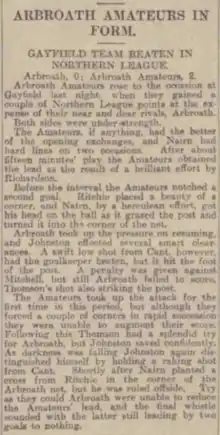 The Amateurs used the Lochlands cricket pitch (previously used by Arbroath Wanderers as its base,[9] but played its more lucrative matches, such as League[10] and occasional Cup matches,[11] at Arbroath's Gayfield.
